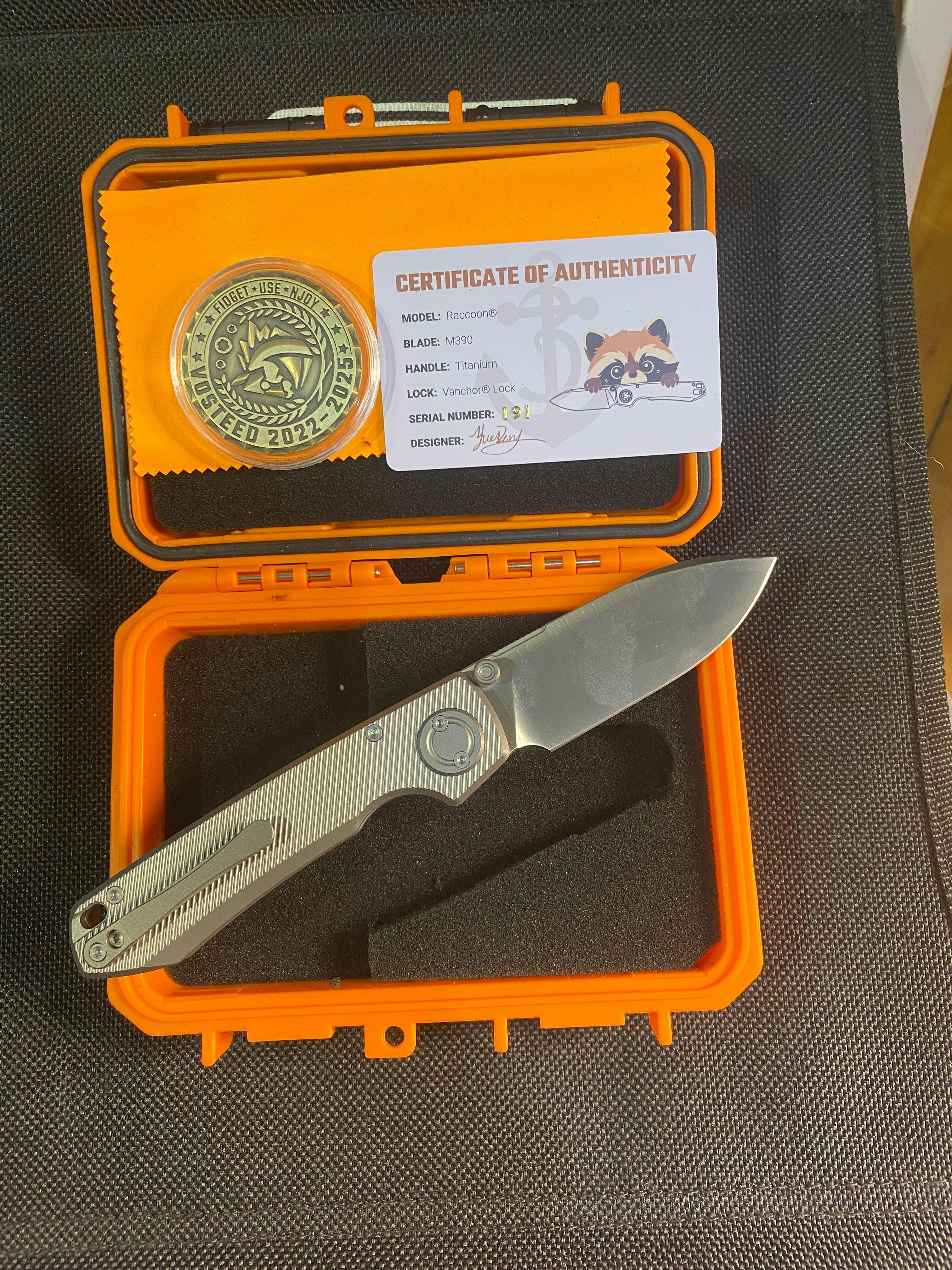 A sleek titanium handle featuring a custom-milled pattern (because even racoons appreciate good armor),